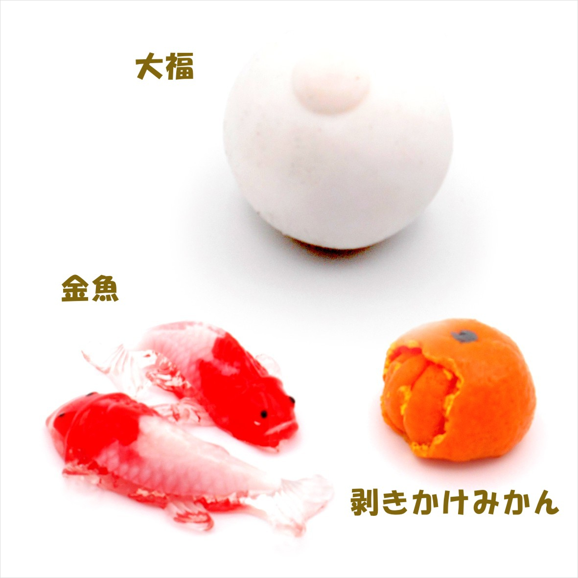 大福×1、金魚2匹×1、剥きかけみかん×1の3点セットとなります。
